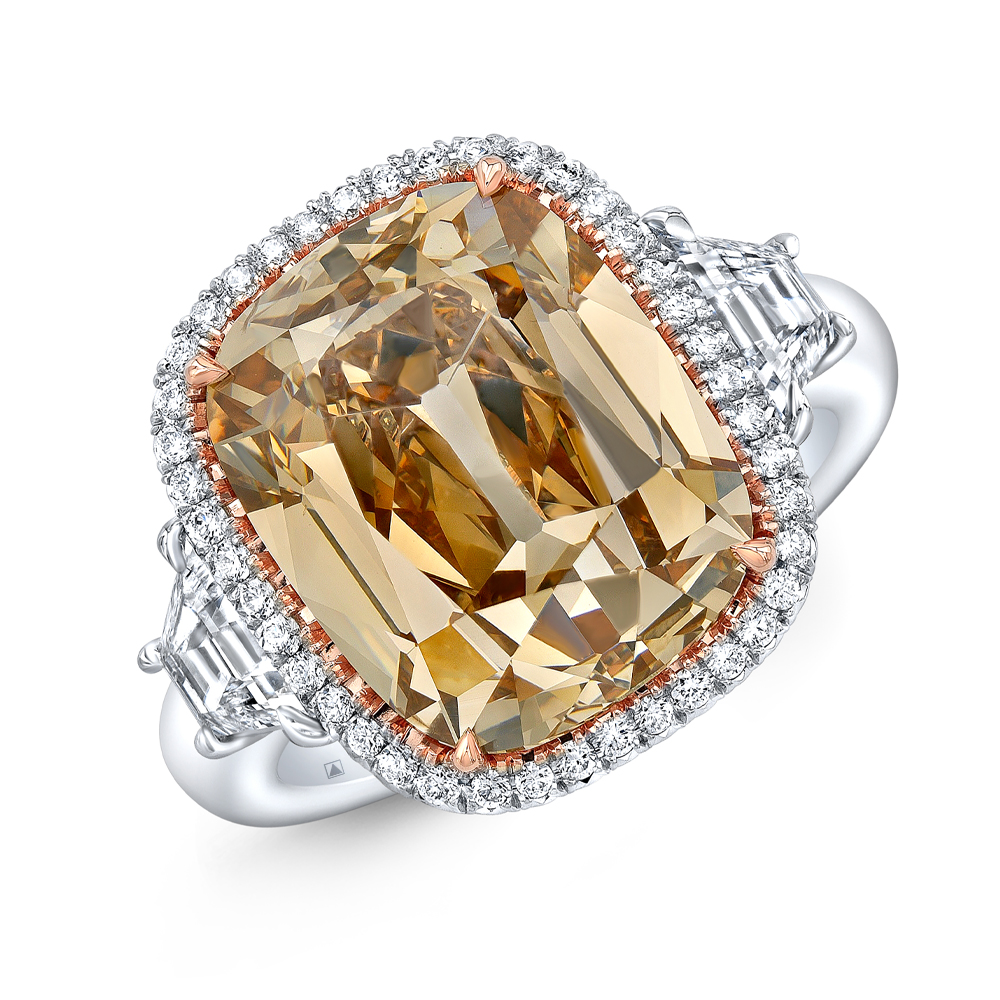 Rare fancy yellowish brown diamond 9.33cts set in platinum and accented by diamonds.