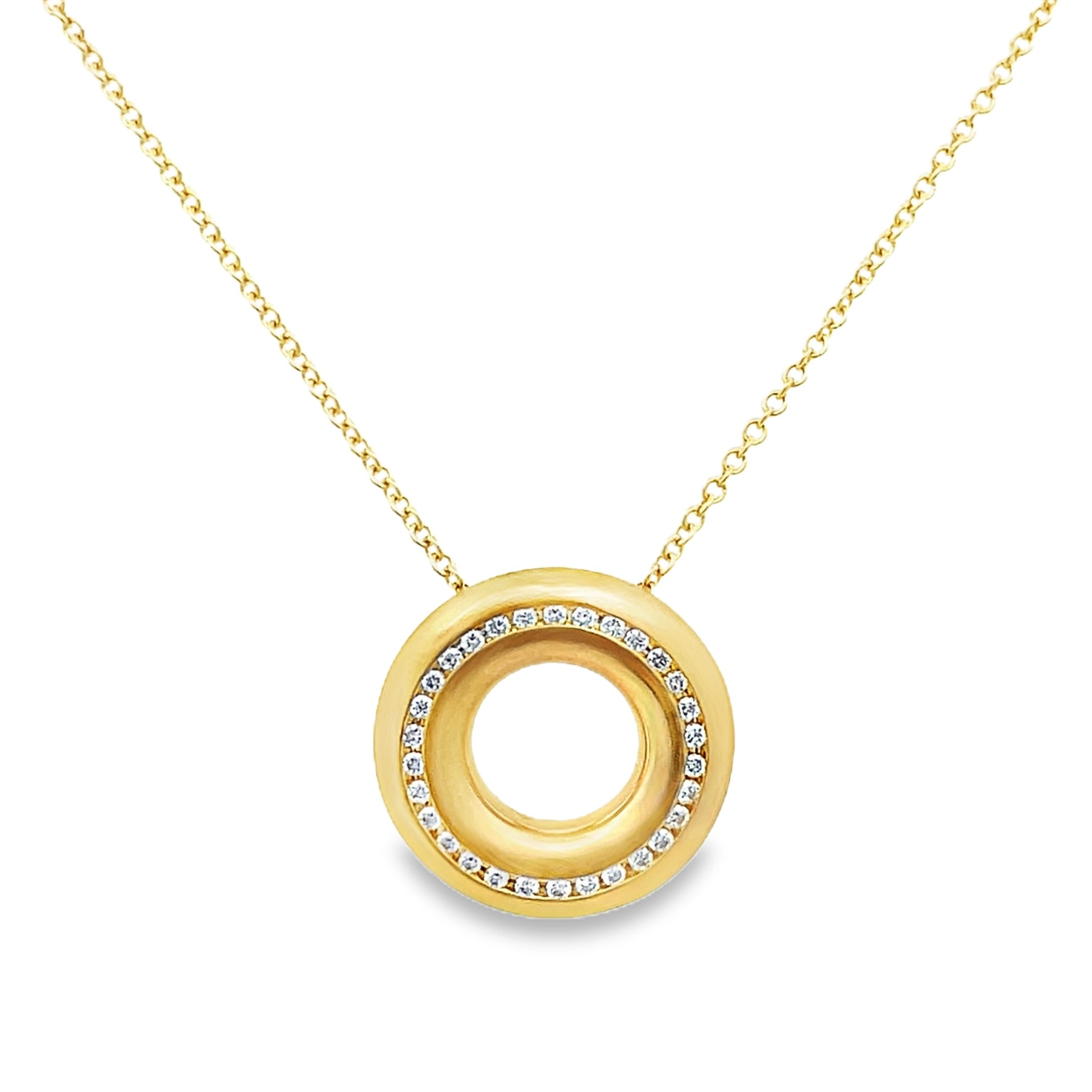 Round shape pendant handmade in 18 karat yellow gold with diamonds.