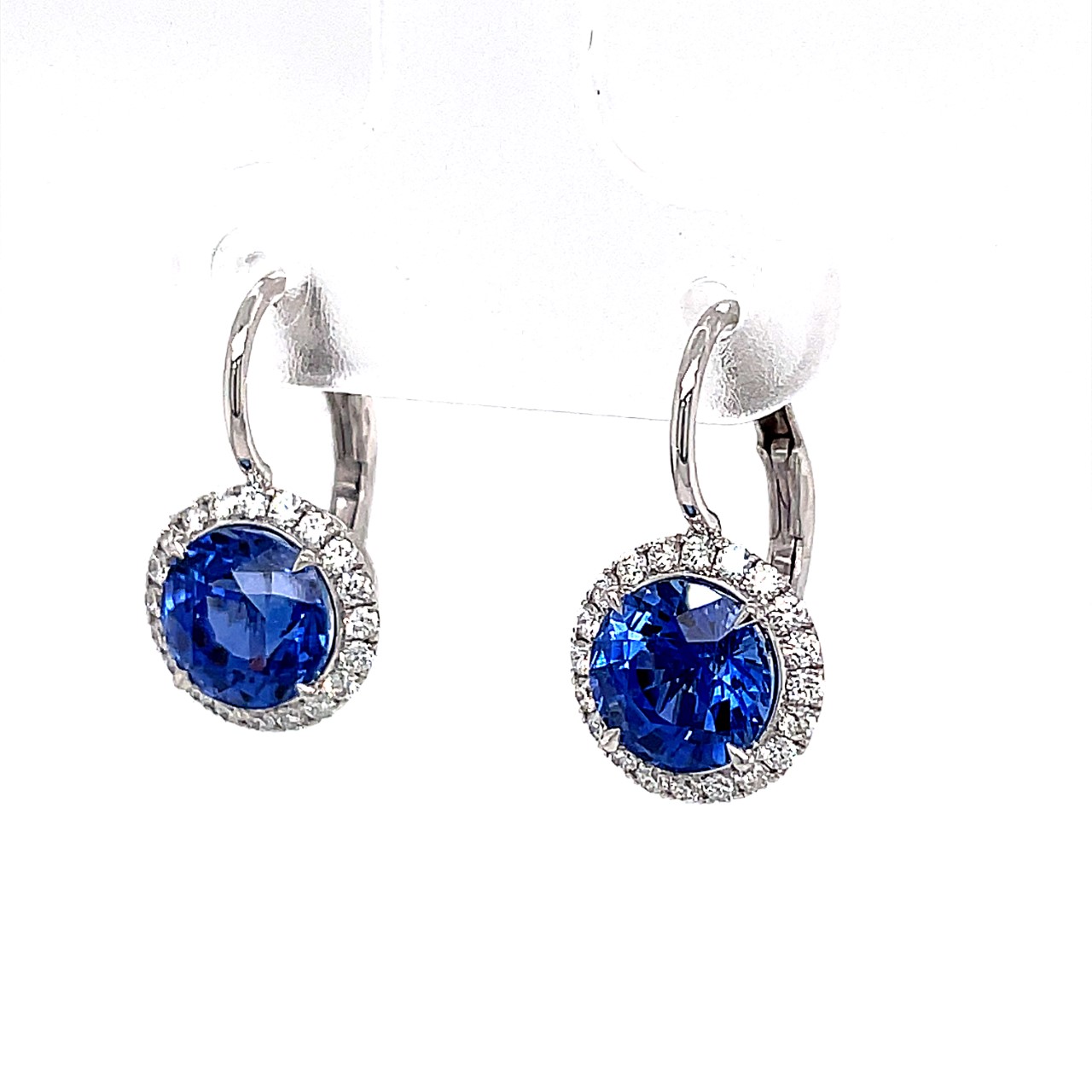 Blue sapphire dangle earrings 2 round sapphires 3.47ctw set 18kt white gold with diamonds.